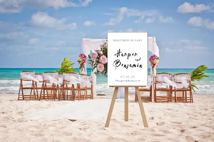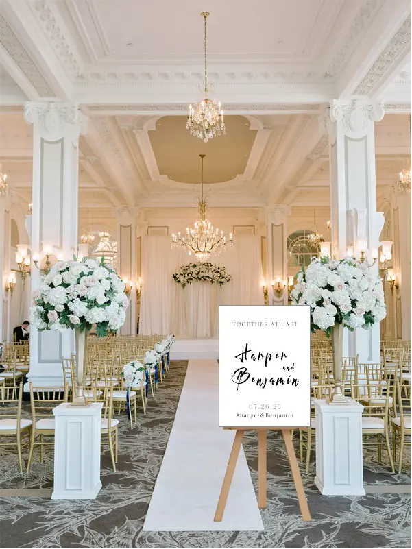 Each custom wedding sign is meticulously crafted and fully personalized with your names and wedding date. Our advanced printing technology ensures crisp, vibrant text on every material, capturing the delicate details of this exquisite design.